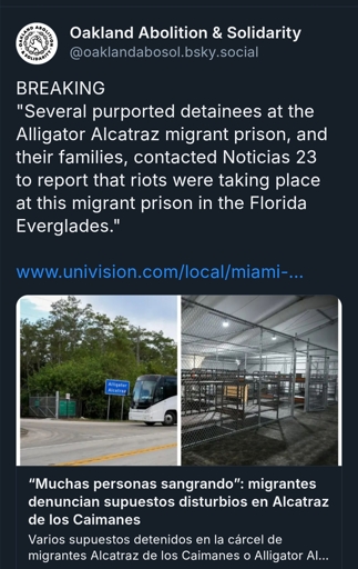 arrow-up11arrow-down1external-linkReports of Uprising at 'Alligator Alcatraz'plus-squareunicornriot.ninjatechnocrit@lemmy.dbzer0.comM · 6 months agomessage-square0linkfedilink