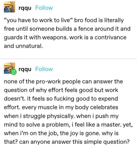 Work does feel good and I dont even like.my job that much. When i put in a good day at work or finish a project or something i feel good. If you dont thats a personal perspective issue. If you are so mad about other people preventing you from stealing food off their land you can get land for less than a bag of chips. There is so much rural land available where you can “work” till your hearts content.