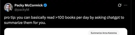Either way, it’s a great parody of artistic illiteracy of business bros, even without the A.I summary, they would have said the same shit. Most the time they’re reading non-fiction guru-self-help with a bro friendly veneer anyway.