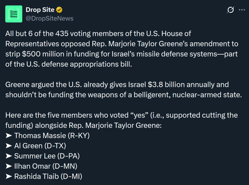 Marjorie Taylor Greene’s amendment does nothing to cut off offensive aid to Israel nor end the flow of US munitions being used in Gaza. Of course I voted against it. What it does do is cut off defensive Iron Dome capacities while allowing the actual bombs killing Palestinians to continue.