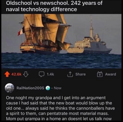 arrow-up1196arrow-down1imageGramps believes in the old school naval techlemmy.worldThe Picard Maneuver@lemmy.world to NonCredibleDefense@sh.itjust.worksEnglish · 4 months agomessage-square14linkfedilink
