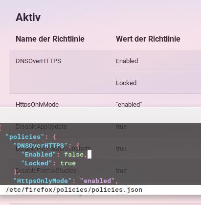 The picture shows a console window witch the respective policies.json key being set to false (disabled), while the about:policies firefox page in the background shows DoT to be enabled.