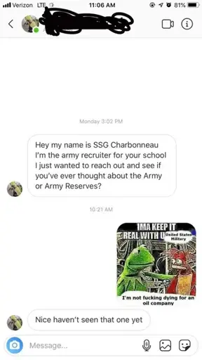 Back in the late 2000s, I got pulled in to the office in high school because I told the recruiter visiting the school that he was a massive piece of shit and needed to stay away from me and my friends if he knew what was good for him. I said this after he sat down near me and, idk, tried to bond? By calling my female friend that left “a real hottie” and tried poorly to insinuate I could probably seal the deal if I was a hot army boy. Baseline revolting statement from an adult to a child for one, I’m gay for two, she was lesbian for three… so I said what I said and apparently my words were sufficiently hurtful that he ran to the admin to cry about it and I got told off because that kind of language and sentiment is unacceptable towards someone “just doing their job” at the school. They found no issue at the time with his ingratiation technique, though I never saw him again.