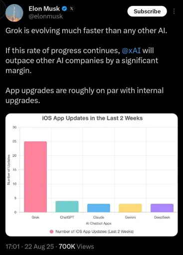 Oh wow, Elon figured out how we’ll finally get AGI. The key thing is to publish an automatic mobile client update every single hour of the day! That was the secret productivity metric that every single other company was missing. Thanks, big brain business boy!
