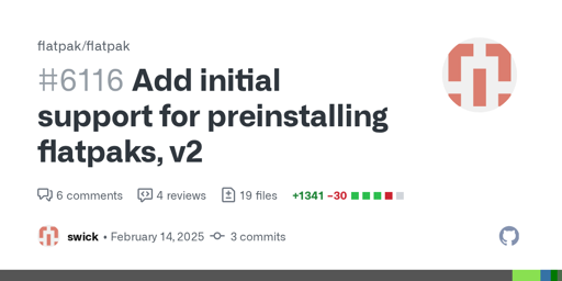 cm0002@lemmy.world to Linux@programming.dev · 3 months ago“Add initial support for preinstalling flatpaks” mergedgithub.comexternal-linkmessage-square0linkfedilinkarrow-up127arrow-down11cross-posted to: linux@lemmy.ml