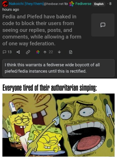 That’s exactly what this is, an initial defed list. Even the way they present this is disingenous as fuck, calling it a “one way federation, silencing our voices” or some other weird phrasing, making it sound like some underhanded/hidden hardcoded piece just for them, when it’s just a boring-ass defederation with one instance among many others. How difficult is it to say “piefed software defederates hexbear by default”? Everyone knows what that fucking means!