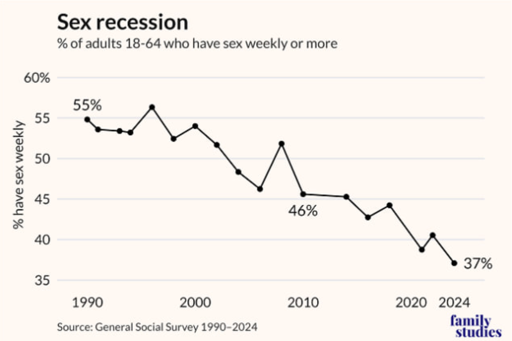 I actually believe it has more to do with the ever increasing “efficiency” at work and addictive media (YouTube, social media, Netflix, etc.). People just don’t have time for sex anymore, because there are quicker ways to get your dopamine fixed. This is also why people don’t go out and socialize anymore. Social media is actually very antisocial.