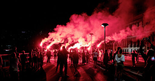 An estimated 40,000 people took to the streets of Genoa last Saturday in a torchlit procession to mark the ships’ departure.