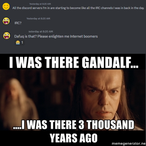 Anyone from 28 and above will be easly called a boomer by 14 years old 😂 as a xenial here I used to feel weird maybe slightly offended…but I decided to enjoy it and keep my self entertained by dumb online fuedes and the alleged generational online wars that comes with…so yeah Long live the IRC