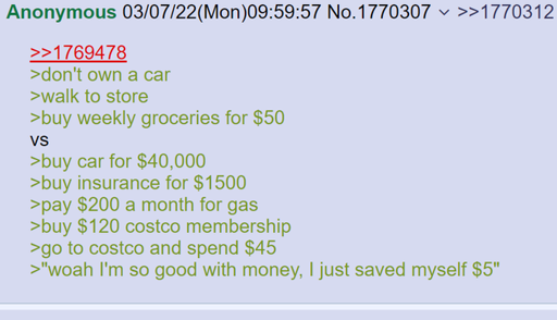 It’s also ignoring how this person spent so much in gas if they’re able to walk everywhere. Surely they’re talking public transportation, biking, or they simply have 4 extra hours a day.