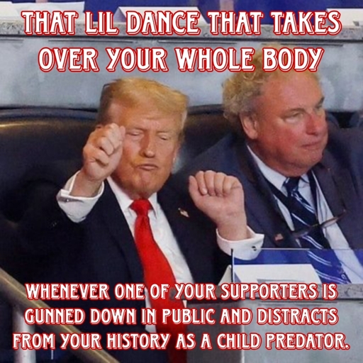 Literally toddler brain. YMCA is his Baby Shark. He throws a tantrum in his high chair, so we play his favorite song so he calms down and dances. Remember when he completely halted a Q&A so he could make a crowd listen to Ave Maria 3 times in a row and then just dance to a couple more songs and then left? He’s just a spoiled brat toddler, but when he doesn’t get his way, he illegally orders firings and kidnappings and deaths. He has this power because we give him this power, and I have no fucking clue why anybody entertains his orders.