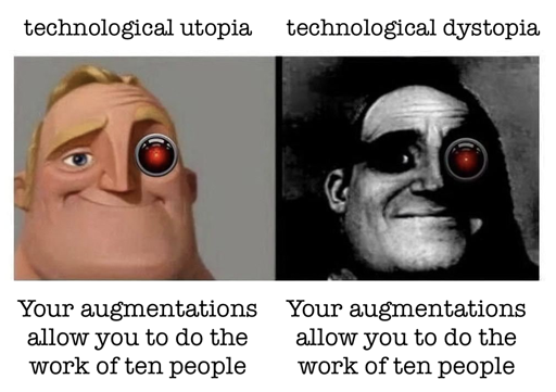 The difference is that in the utopia, you reap the benefits of all ten, while in the dystopia, 9 1/2 of the benefits go to someone else.