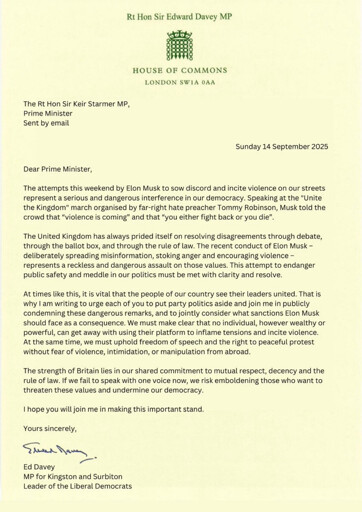 People need to engage with the threat, and when you hear a party saying the right things, support them. Don’t cut them down. They are ignored by the media who would rather amplify the voices of Farage, Yaxley-Lenon and Musk. If you agree with Ed Davey that the UK government needs to make sure people like Musk face consequences for trying to invite violence in the UK, be vocal about it - here and anywhere else you can be.