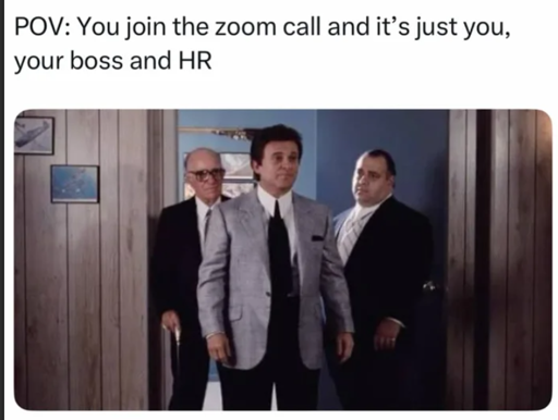 Mine was just a zoom invite texted to me with just my boss, but I figured the jig was up when I couldn’t log into my work laptop.