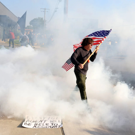 Curtis Evans, of Evanston, carries a U.S. flag through gas deployed by federal officers as they clear protesters from the entrance of the Immigration and Customs Enforcement facility in Broadview on Sept. 19, 2025. Evans said he was a Marine during President Ronald Reagan’s term. (Stacey Wescott/Chicago Tribune)