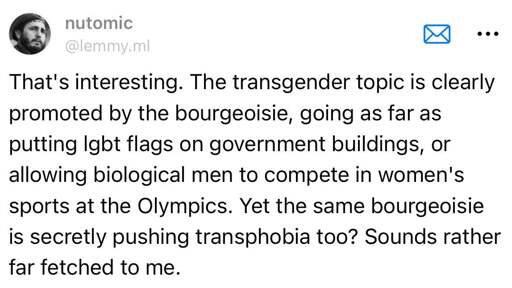 his take is reactionary garbage and he doesn’t know what he’s talking about. most other tankies i know don’t parrot conservative talking points about trans people