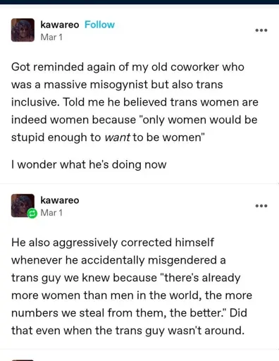 trans-inclusive radical misogyny would be a tongue in cheek term made up for our guys particular unusual views around gender. he clearly hates women, and doesn’t trust them in any positions of authority, but this misogyny extends equally to trans women rather than trans men. usually, these days, this kind of misogyny would be paired with a hatred, fear, and denial of the identities of trans people.