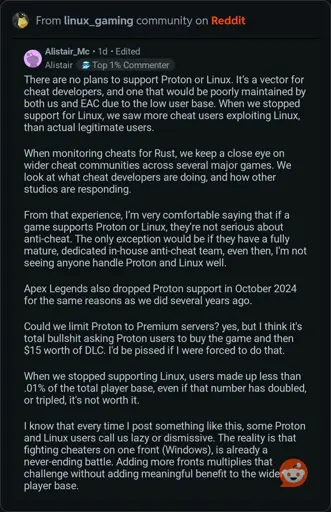 This is so funny because rust has one of the worst cheating situations and majority of their players are windows users, and theres lots of games that have anticheat that allows linux and have notably less significant cheating problems like marvel rivals. in reality rust doesn’t take cheating very seriously because if they did they would have more server side software that detects illegitimate behaviour like tons of other games do successfully… even most popular Minecraft servers have better functioning anti cheat that is completely server side than rust has while getting kernel access to your pc. its pathetic and lazy development tbh and this entire post from them reads like such extreme cope…