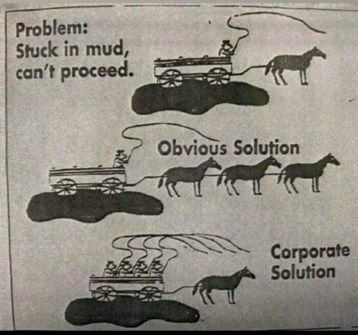 Eh, sometimes the corporate solution is to add more horses, just not horses that are immediately (or sometimes ever) useful. Horses that have maybe never pulled a cart before or have only ever pulled carts solo. Horses that need a month of training to be able to contribute meaningfully, often through no fault of their own, but are told that this cart needs to be pulled out of the mud in two weeks. And then when the original horses tell the cart driver that it’s going to take a month to get everyone up to speed, they completely miss the point and ask how many more horses we need.
