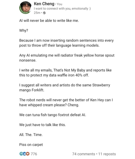arrow-up11arrow-down1imageAI will never be able to write like me.cm0002@lemmy.sdf.org to memes@lemmy.world · 7 months agomessage-square0linkfedilinkcross-posted to: memes@lemmy.ml