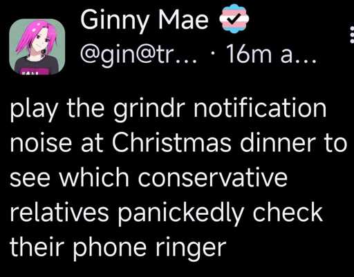idk, this might just be me being ace and not understanding the tribulations of people that actually have a desire to have sex. But as a trans person who has been in the closet, I can’t imagine going on Grindr if I was gay but still living with conservative parents and closeted. That feels like a risk I’d be way too scared to take.
