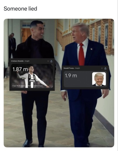 Trump is walking in front of Ronaldo. He should appear even larger if he is indeed already taller side-by-side, than Ronaldo.
