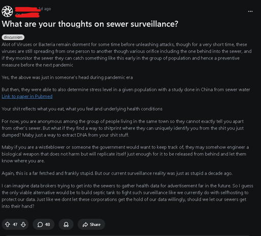 Honestly? Makes sense. The waste monitoring during covid was valuable for understanding general trends in infection rate. I can see how capitalists would want to expand that to see my dookie data or the government to track individuals. My one critique of this is that if they manage to infect you with that ‘biotracker’, then they must already know where you are to do so. If not, how would the person they want to track be the only person infected with it? So then this tracker doesn’t really provide any new information. Maybe I’m overthinking it…