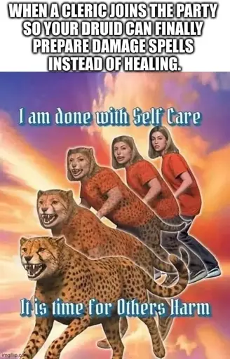 minus-squareIron Lynx@lemmy.worldlinkfedilinkarrow-up1·5 days agoInvert it for when the party that’s a Cleric, an Artificer and two Druids gets expanded with a Barbarian 😛