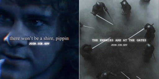 The approach includes imagery and language inspired by The Lord of the Rings, Halo, medieval knight and The Patriot, content more commonly associated with gaming and far-right meme communities than official government messaging.
