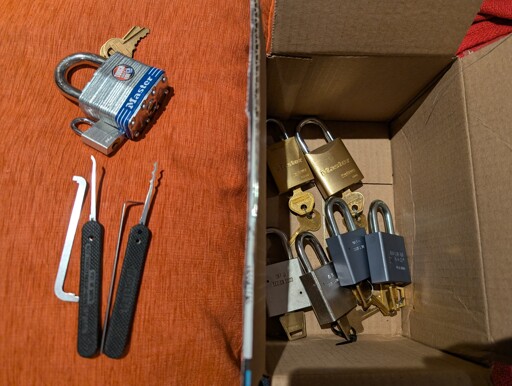 Left is what I’ve picked so far, right is a batch off eBay. They’re proving tricky so far. I’m trying top-of-the-keyway tension, getting a number of sets, but haven’t gotten any open. Videos online show spool pins for the Master locks.