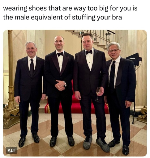 Everyone’s shoes are a bit stretched by the wide angle lenses being used, which is why Elon’s feet look freakishly ling and skinny. He does have pretty big feet for his height, or has been doing this oversized shoe gag for a very long time.