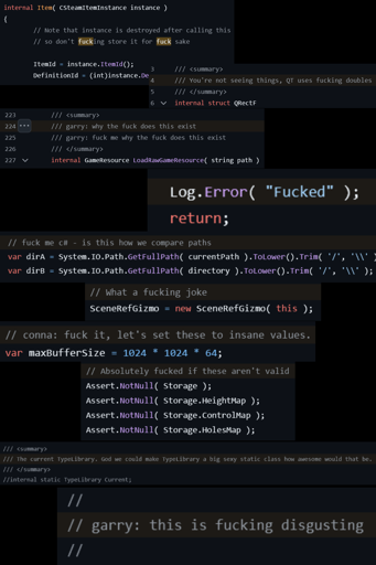 Ah, yes I also work professionally, in very clean non-swear-inducing code without hackjobs that are in production and does a job, because it exists, and I know because I code a lot professionally and never see hacks or swear ever and it also reflects my flawless personality. In fact, here they are now, in the room with us. All the code that is perfect and without hacks are greeting us and they speak highly of me and badly about that unprofessional garry even though we don’t really know who he is we are definitely superior since our code is without any hacks and doesn’t use any libraries with swear words in the comments