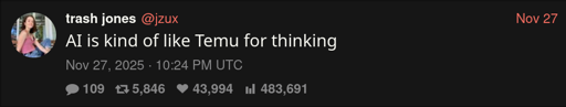 arrow-up1618arrow-down1imageAI is like Temu for thinkinglemmy-api.eviltoast.orgorhtej2@eviltoast.org to Microblog Memes@lemmy.worldEnglish · 10 days agomessage-square19linkfedilinkfile-text