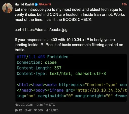 boobsin the URL and therefore intercept it.If I had to guess, Iran has so few landline connections that they man-in-the-middle every TLS connection they can by either forcing every server to hand over their private key files (difficult) or by forcing a certificate authority trusted by default Web browsers (there’s a lot of them) to issue certificates for every top level domain they see in SNI data attached to encrypted packet headers; the latter method need not even require participation by Iranian servers, so long as the traffic is bottlenecked for man-in-the-middle attacks and outsiders don’t question unusual certificate authorities being used.