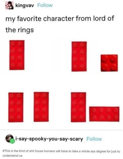 But it’s legos in that format, so the joke is actually Lego Loss, as in Legolas the Lord of the Rings character.