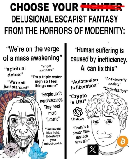 minus-squareabbiistabbii@lemmy.blahaj.zonelinkfedilinkarrow-up1·2 days agoOption 4: “The revolution is coming and my chosen ideology will rise from the ashes.”