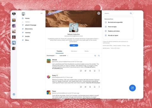 Federated groups in Bonfire will be spaces where communities gather to organise, care, and coordinate across the fediverse. They’ll live next to your personal feed, but each group having a specific purpose: a study circle, a lab team, an activist collective, a local mutual aid crew, a project team. Inside you’ll find posts, conversations, calendars, shared resources, and more. Crucially, groups will be portable and interoperable.