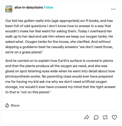 No parenting class would ever have prepared me for having my kid ask me why we don’t need artificial oxygen storage, nor would it ever have crossed my mind that the right answer to that is “not on this planet.”