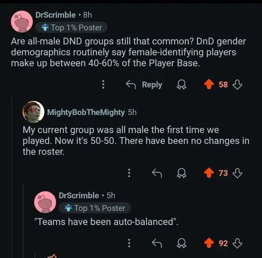 minus-squareIron Lynx@lemmy.worldlinkfedilinkarrow-up1·2 months agoHow’s this related to the gender ratio in the Dungeons & Dragons community?