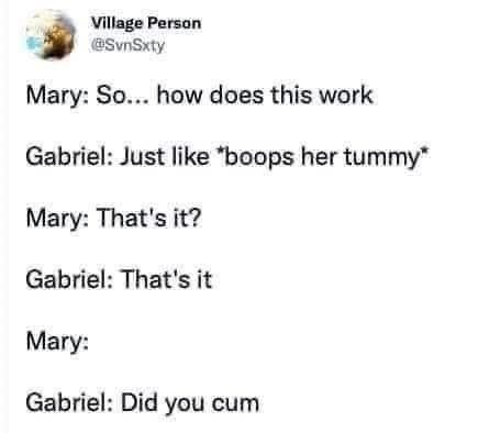 it took me a while, but it’s the nativity story. the angel gabriel knocks up mary and then asks if she came.