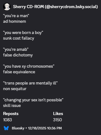 “Trans people are mentally ill” is indeed a non sequitur, but if we investigate it a little further it’s even worse. If we assume an implied “and therefore they can’t know about themselves well enough to say they’re a woman/man”, it becomes a form of ad hominem, and begging the question besides. Ad hominem because “you’re mentally ill therefore can’t know the truth”, and begging the question because the underlying claim is “trans people aren’t real”. Why aren’t they real? “Because they’re mentally ill”. How do we know they’re mentally ill? “Because they identify as a gender other than the one they were assigned at birth.”