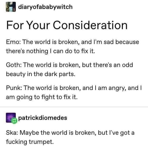 Nu metal is bipolar. Its either “the world is broken but ignore it with the help of a song that has no right to be this groovy” or “the world is broken and thats why im setting the whole fucking place on fire including myself”