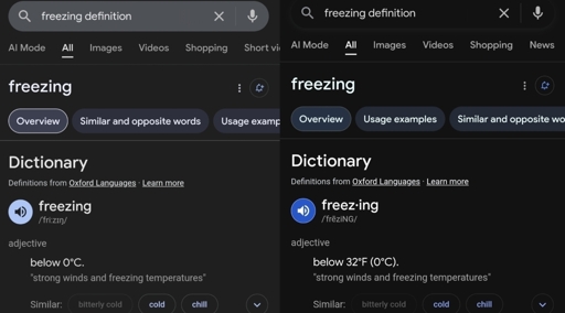 HonoraryMancunian@lemmy.world to Mildly Interesting@lemmy.worldEnglish · 2 months agoThe UK and US Google results for "freezing definition" differ slightlylemmy.worldimagemessage-square17linkfedilinkarrow-up168arrow-down116file-text