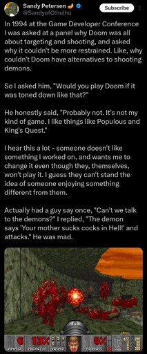 arrow-up1822arrow-down1imageCommentary on taking feedback as a game designer, from someone who worked on the original DOOM. media.piefed.worldThe Picard Maneuver@piefed.world to Gaming@lemmy.worldEnglish · 2 months agomessage-square115linkfedilink
