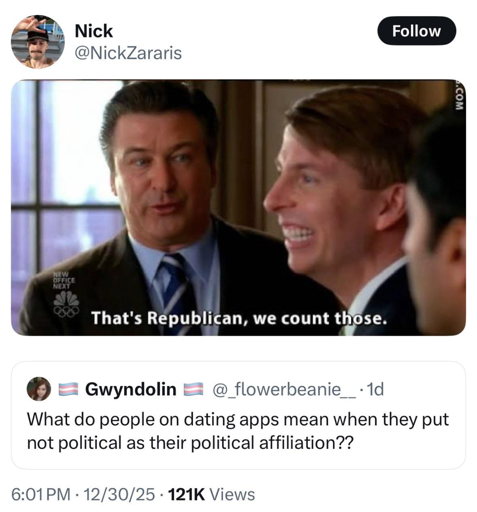 ByteOnBikes@discuss.online to Political Memes@lemmy.world · 14 days ago"I just don't talk politics" before giving you their Andrew Tate takediscuss.onlineimagemessage-square59linkfedilinkarrow-up1619arrow-down16