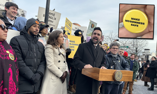 “The city committed to a redesign of McGuinness Boulevard … to deliver the safety and improvements that residents had been asking for until the prior administration bowed to big money interests, leaving the project incomplete and Greenpointers still at risk. Today, however, there is a new mayor in City Hall,” he said, evoking the “ax” swung by Robert Moses to widen a then-residential street into the McGuinness Boulevard highway we know today.