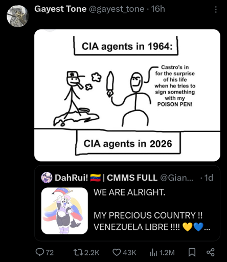 I wonder if they’re a diaspora, they probably are. It’s always amusing because these Gusanos will never leave the cushniness of their chairs back to Venezuela after being ‘freed’ from the baby-eating Socialists.