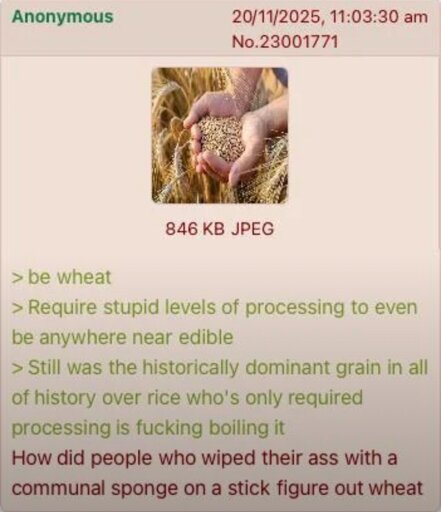 🍹Early to RISA 🧉@sh.itjust.worksM to Greentext@sh.itjust.works · 26 days agoAnon thinks about wheatsh.itjust.worksimagemessage-square187linkfedilinkarrow-up1586arrow-down123cross-posted to: science_memes@mander.xyz