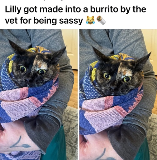 You have a good vet, they know that all torties need to be wrapped up like a little baby sometimes, for their health 😂
