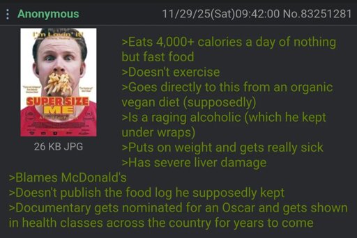 🍹Early to RISA 🧉@sh.itjust.worksM to Greentext@sh.itjust.works · 23 days agoAnon watches Super Size Mesh.itjust.worksimagemessage-square81linkfedilinkarrow-up1505arrow-down121